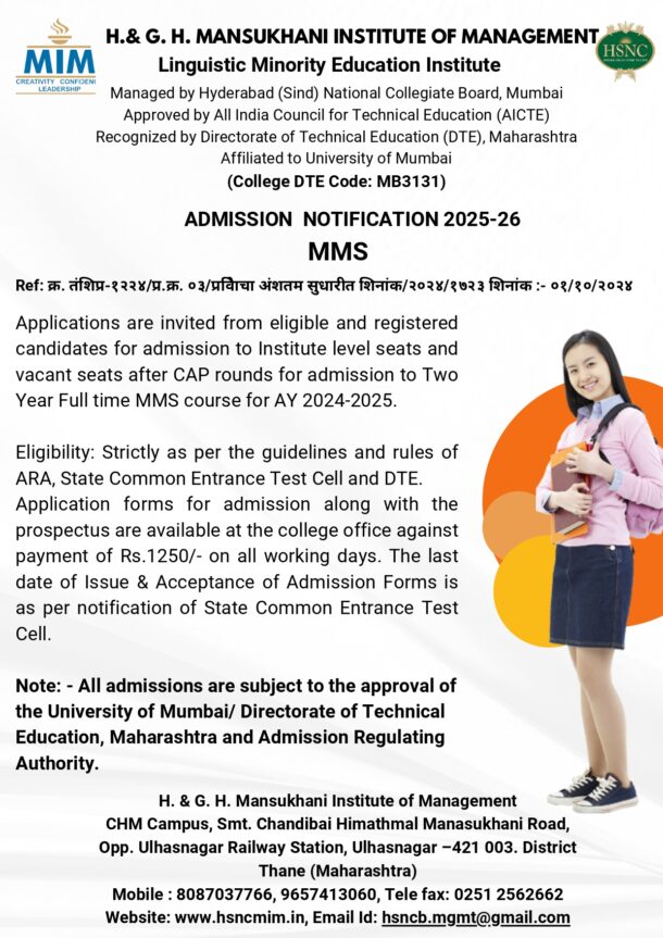 At H.&G.H. Mansukhani Institute of Management, we take immense pride in being a constituent of the illustrious Hyderabad (Sind) National Collegiate Board (HSNCB) — an educational trust that has for decades nurtured intellect, discipline, and leadership rooted in Indian values and global vision.